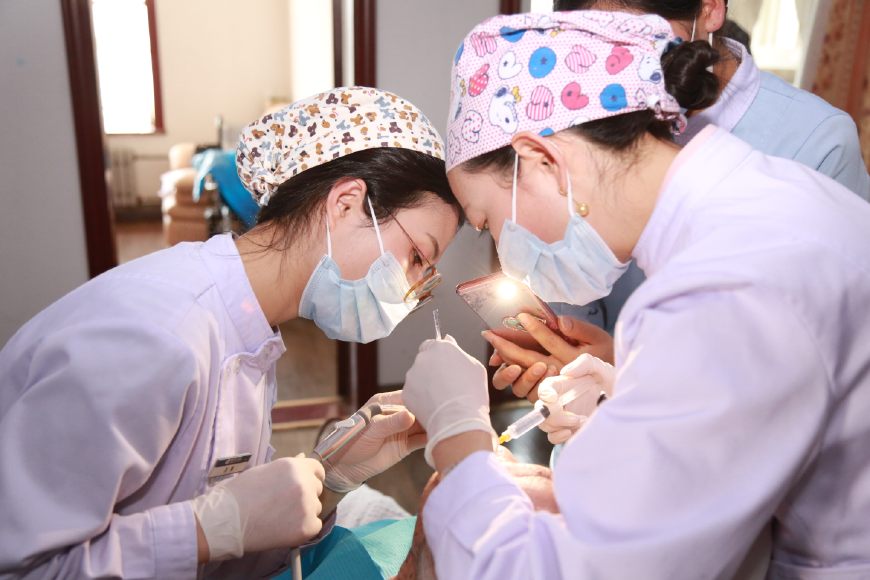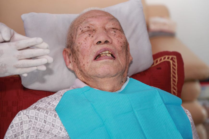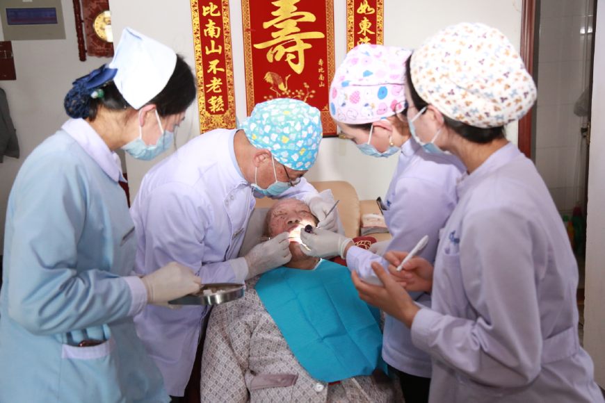 杨教授和邓院长首先给老人做了一个口腔的全面检查,在女儿的帮助下,老人很配合,检查后发现,老人由于爱吃糖,平时也不刷牙,局部牙齿已经开始烂掉,治疗难度非常大。经过商量后,采用保守治疗,首先开始清洗,为了方便上门给患者服务,医院采购了便携式医疗床,牙科移动治疗机,让患者减少痛苦,享受和医院一样的治疗。